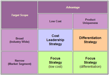 A company's advantages or strengths largely determine its position in the industry. As it was suggested by Michael Porter, cost advantages and differentiation are the major two aspects of a company's strengths. There are three generic strategies from these advantages whether they are used in a narrow or broad scope, including focus, differentiation and cost leadership. Below figure is the illustration for Porter’s Generic Strategy (Eldring, 2009).