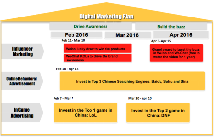 On the other hand, according to the analysis of business environment, it advised a digital marketing plan including Influencer marketing, online behavioral advertising and In-game advertising. Firstly in terms of influencer marketing, it contains 3 parts: Weibo lucky draw to win the products, We-Chat KOLs to drive the brand awareness and Grand award to burst the buzz in Weibo and We-Chat. Secondly in terms of Online behavioral advertising, the Storm Magic Mirror will invest the Top 3 Chinese searching engines including Baidu, Sohu and Sina. Finally in terms of In-game advertising, it contains two parts: the first part is to invest the came called LoL. It will start from Feb 7 and end on Mar 7. LoL got the largest players in China: by the end of 2015, the quantity of players was 30.2 million, and it equaled to 1.6% of Chinese population. The second part is to invest the game called DNF, which had 3.4 million.