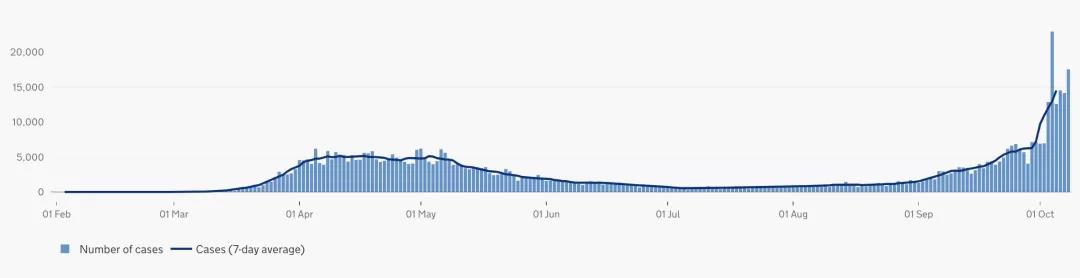 當地時間9月21日至10月4日,曼徹斯特大學共確診1061例,其中學生確診1041例,教職員工確診20例。曼大目前已成為英國大學中確診人數最高的院校。