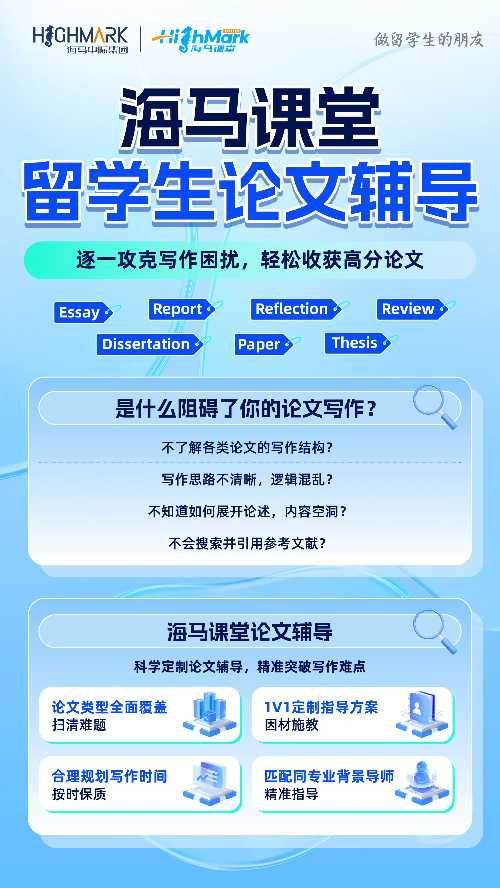 你在寫論文時完全沒思路嗎?別擔心,海馬課堂來了!海馬課堂擁有九年論文輔導經驗,團隊均是海外名校碩博導師,幫助你從選題到寫作全程把控。在輔導過程中,導師會根據學生基礎情況定制輔導方案,梳理選題和寫作思路,建立大綱,制定專屬學習計劃,助你突破寫作瓶頸。讓你寫出完美論文。還等什么?趕緊行動起來吧!