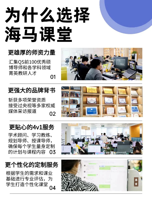 正是憑借著廣泛的業務覆蓋、豐富的服務項目、全面的專業覆蓋以及嚴謹的服務流程,海馬課堂才得以成為留學生們信任的伙伴機構。在未來的日子里,海馬課堂將繼續秉持初心,不斷優化服務,為更多留學生的學業成功保駕護航,陪伴他們在留學之路上越走越遠,收獲更多的知識與成長。