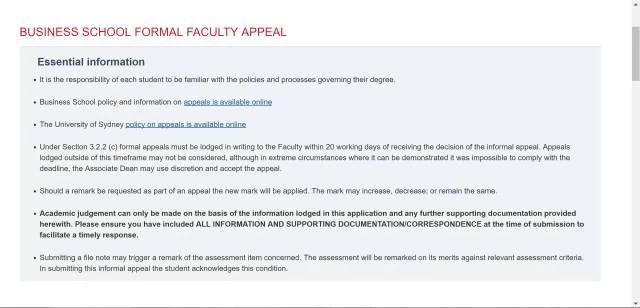 學生可就“非正式申訴階段”沒有解決的問題,向faculty提出進一步申訴。該階段要求學生在非正式投訴最終結果出來的20個工作日內填寫Formal Appeal From并提交給Student Information Office繼續(xù)申訴。一般遞交申訴的在10個工作日內會收到來自Dean給出的Written Decision。