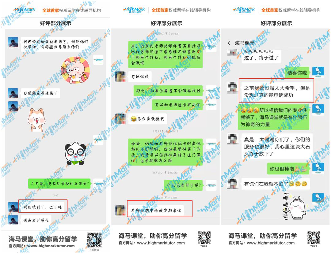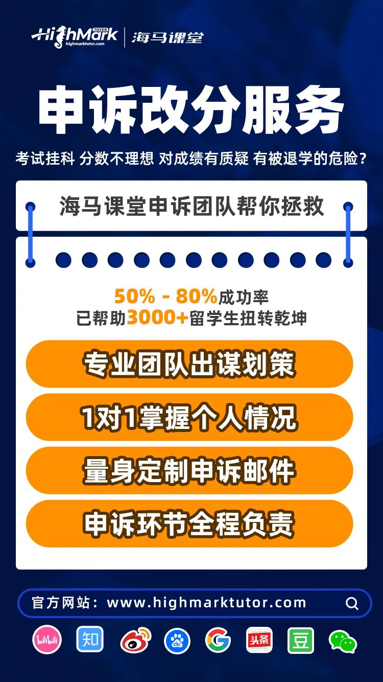 為了增加Appeal成功的幾率,同學們可以在第一時間咨詢海馬課堂的學習規(guī)劃師哦,我們有專業(yè)的精英導師團隊,會針對每一名學生的具體情況為同學們量身定制申訴服務,幫助同學們繼續(xù)學業(yè)。