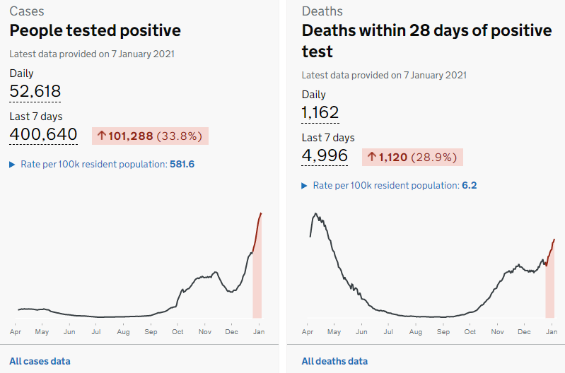 今天我們來繼續關注今日的英國疫情速報。根據英國時間1月7日下午新出的數據,英國新冠總確診人數為2,889,419,單日新增確診人數為52,618人,單日新增死亡人數為1162人。這是自去年四月以來,單日新冠死亡人數連續第二天破千。
