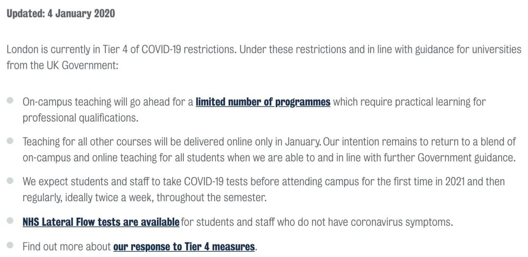 英國的開學時間又推遲了!由于新冠病毒變異后傳播力大大增強,英國進入第三次全面封鎖,大學生們的返校時間被推遲到 2 月 中 旬 ,比之前規定的1月25日再次推遲兩周。下學期開學安排是什么?網課還是面授?我們給大家整理了倫敦各大學最新開學計劃匯總,幫大家持續關注動向,希望這次封鎖能真正有用吧!