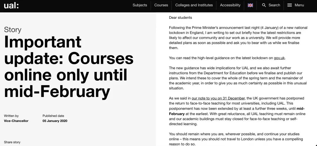 UAL表示,2月中旬之前,大學只會進行線上教學。