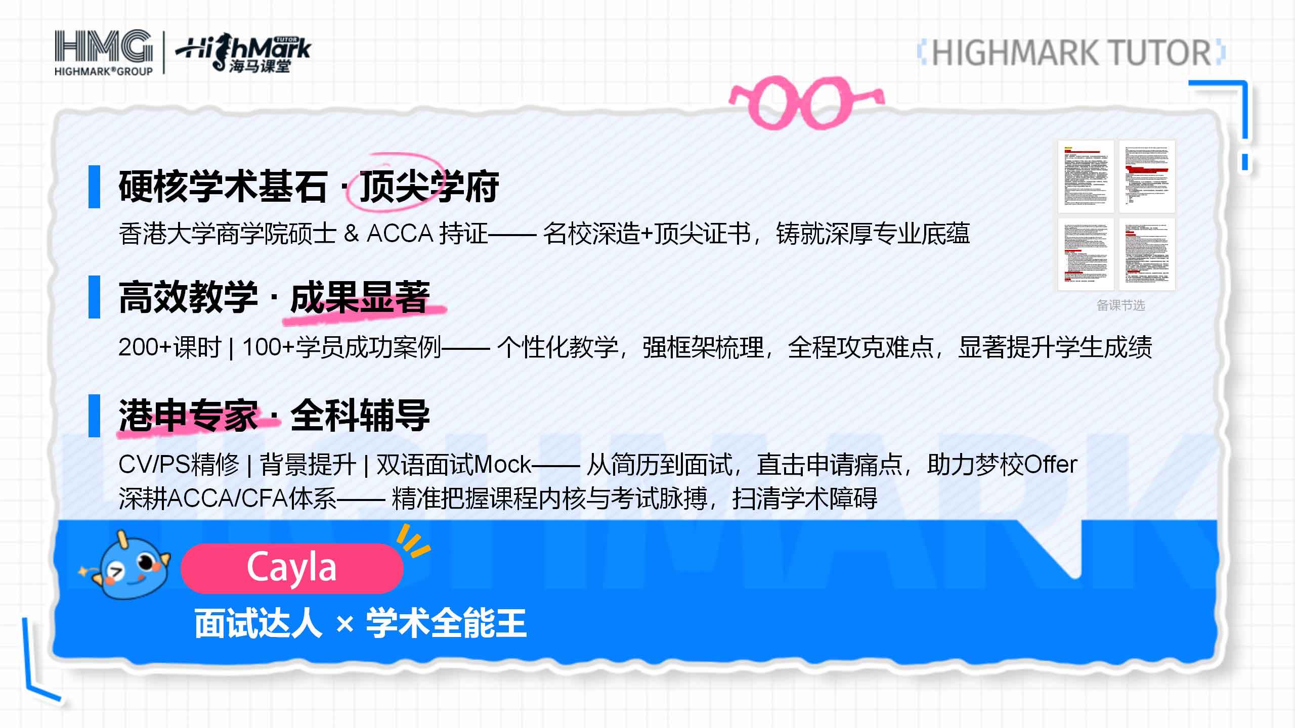 專業背景:香港大學商學院碩士,持ACCA資格證,理論專業度+實操能力雙強。