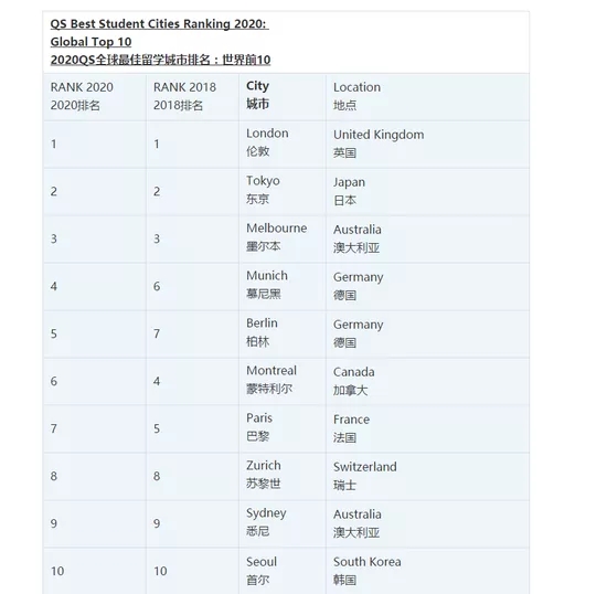 此前,倫敦時間2019年7月31日,QS全球教育集團發布了最新全球最佳留學城市排名。
