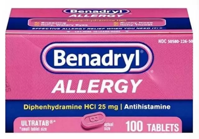 對于過敏引起的打噴嚏、流鼻涕、流眼淚、瘙癢、麻疹、皮疹等癥狀,可以使用Benadryl治療,該品對酒精過敏也有效果。