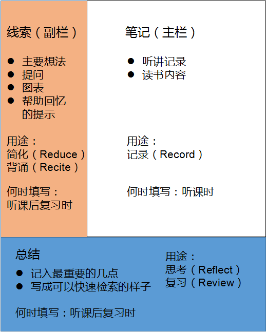 o筆記被分為三欄:筆記欄通常在右邊,是左側(cè)的線索欄(副欄)的大小的兩倍。頁面底部留出五至七條線,或約5厘米,作為總結(jié)欄。